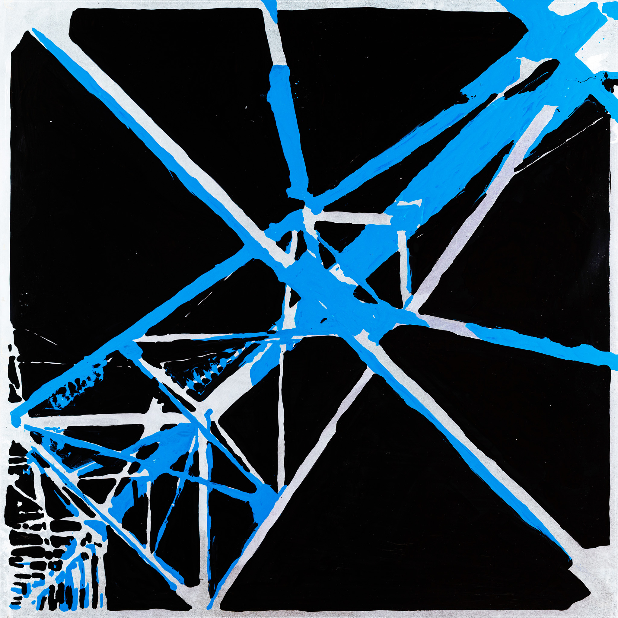 In the series Dynamics, the artist explores the relationship between movement and balance in visual space. The contrasts used in the paintings between black, silver gray, and bright blue create an intense tension that feels both technical and emotional at the same time. The network of lines resembles energy flows or communication structures that connect different points and directions — just like invisible systems in our everyday lives. The works invite the viewer to perceive movement not only as a physical phenomenon, but also as an internal state — a force that drives change, creates new order, and reveals the interplay between chaos and structure.
